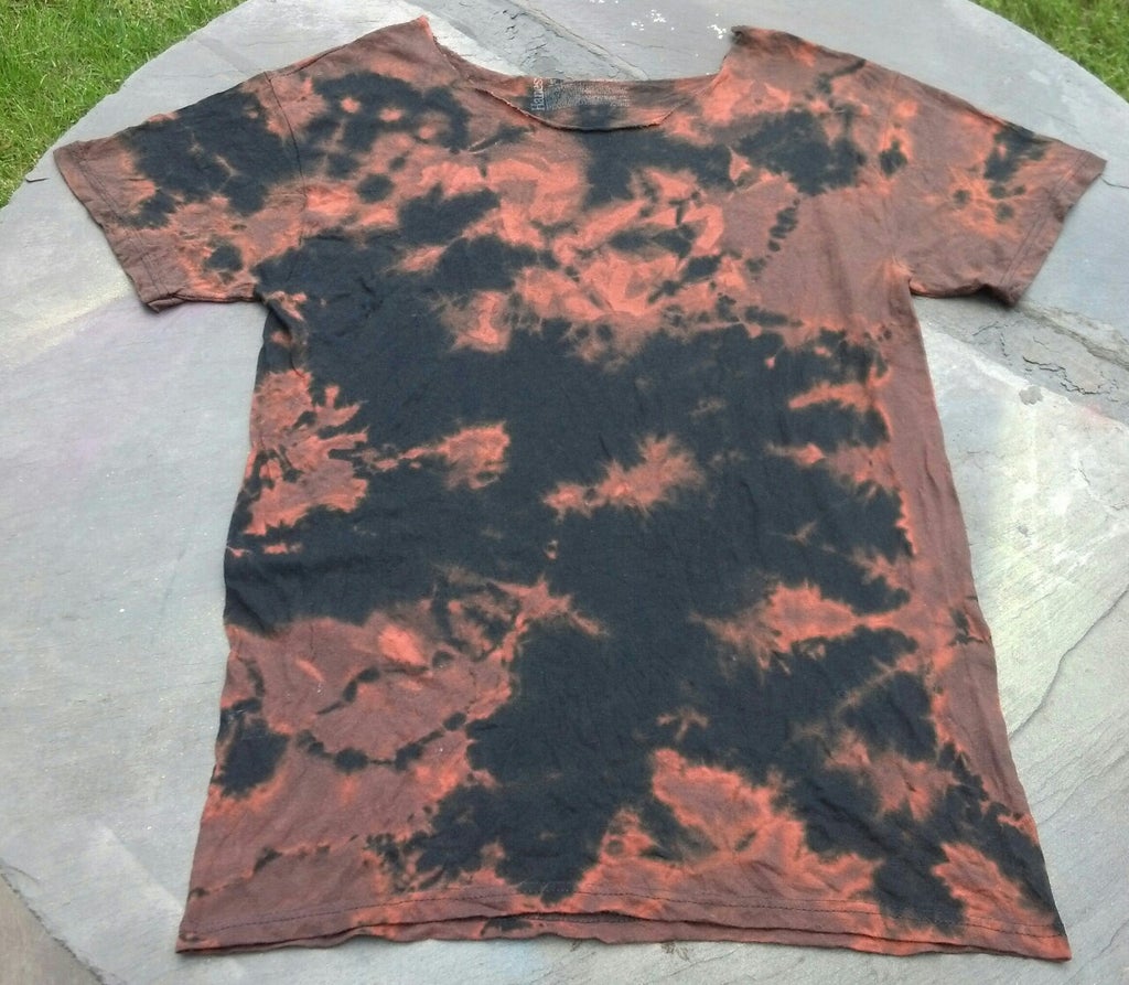 Reverse Tie Dye. You will need to take some precautions. The bleached faded parts will appear brown or orange-ish and thats normal.